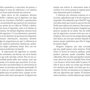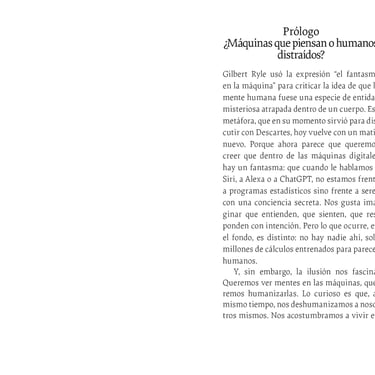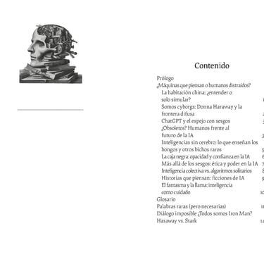 Con un lenguaje accesible y provocador, el libro recorre los debates filosóficos y científicos más urgentes de nuestra época. A través de la metáfora de la habitación china de John Searle, se plantea la diferencia entre procesar símbolos y comprender significados, recordándonos que una respuesta coherente no siempre es señal de inteligencia real. De la mano de Donna Haraway y su manifiesto cyborg, se exploran las fronteras cada vez más difusas entre lo humano y lo artificial, abriendo preguntas sobre identidad, cuerpo y tecnología.