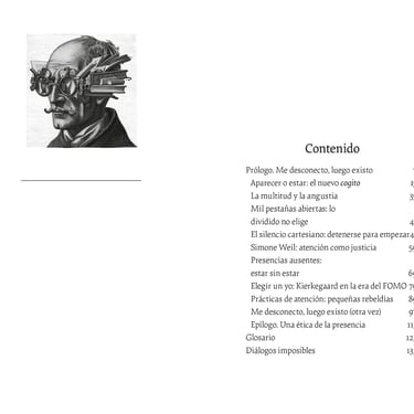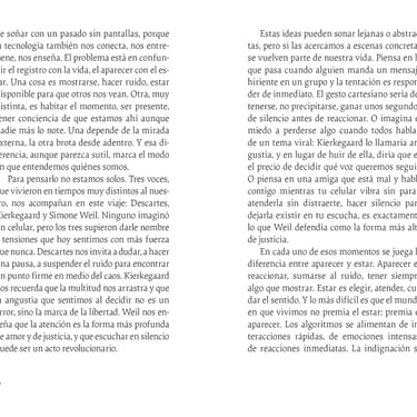 Con la guía de tres pensadores —Descartes, Kierkegaard y Simone Weil—, el libro abre un viaje filosófico cotidiano y accesible. De Descartes, la posibilidad de pensar como base de la existencia. De Kierkegaard, la angustia entendida no como un peso, sino como la marca de nuestra libertad de elegir. Y de Weil, la atención como forma radical de justicia y de encuentro con el otro. Estas tres claves —pausa, angustia y atención— se presentan como herramientas prácticas para repensarnos en medio de un ecosistema digital que premia la inmediatez, pero olvida la profundidad.