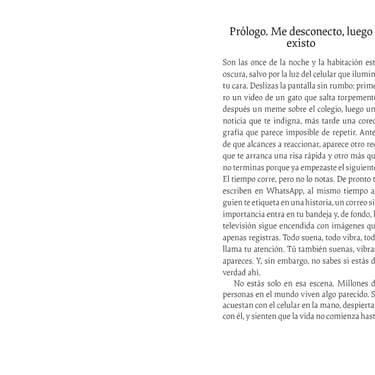 Son las once de la noche. La habitación está a oscuras y solo la pantalla del celular ilumina el rostro. Entre videos, memes, notificaciones y mensajes, las horas se escurren sin darnos cuenta. Estamos presentes, pero ¿realmente estamos ahí? Este es el punto de partida de Me desconecto, luego existo, un libro que propone detenernos en medio del ruido digital y preguntarnos qué significa existir en una época donde “aparezco, luego existo” parece reemplazar al “pienso, luego existo” de Descartes.
