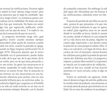 Lejos de condenar la tecnología o de añorar un pasado sin pantallas, este libro invita a una reflexión más profunda: ¿qué lugar ocupan hoy la atención, la presencia y el silencio en una vida hiperconectada? En un mundo donde la visibilidad parece confundirse con la existencia, donde cada instante parece válido solo si está registrado, compartido y comentado, el texto se convierte en un compañero crítico y cercano que ayuda a distinguir entre vivir y simplemente aparecer.